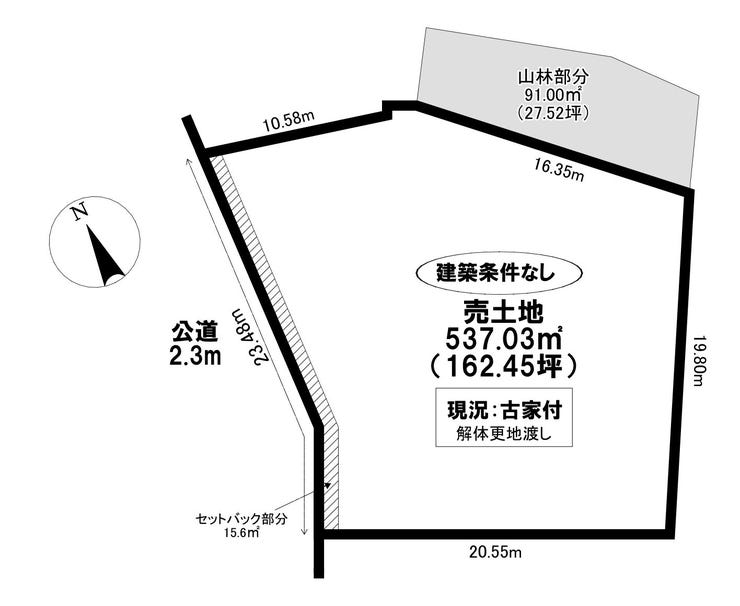 | 備考 | ■建築条件なし~お好みのハウスメーカーで建築可能~ ■解体更地渡し ■確定測量済み ※敷地面積628.03㎡内、有効面積は521.43㎡(157.73坪) (山林部分:91.00㎡(建築不可部分)、セットバック部分:15.60㎡) |